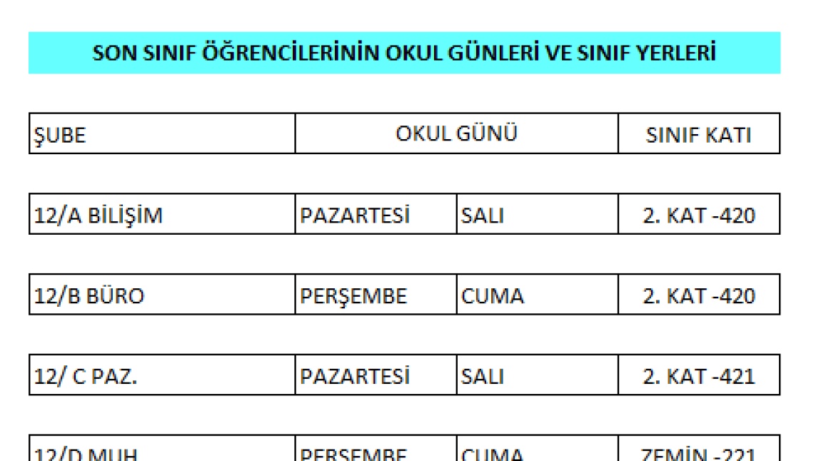 Okul Günleri ve Okuldaki sınıflarının katları aşağıdadir